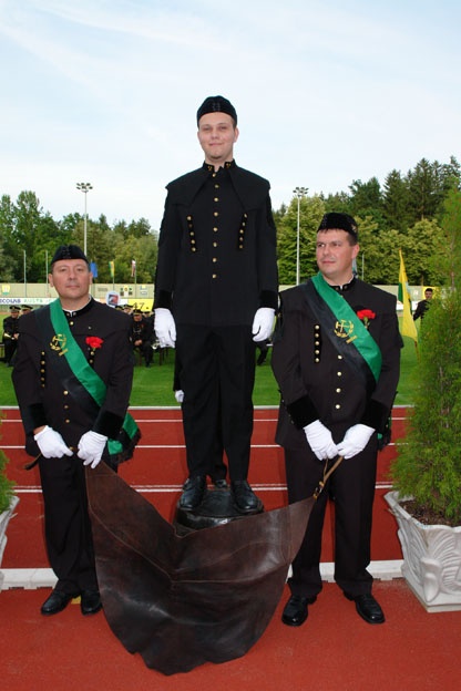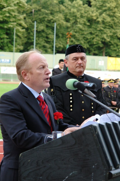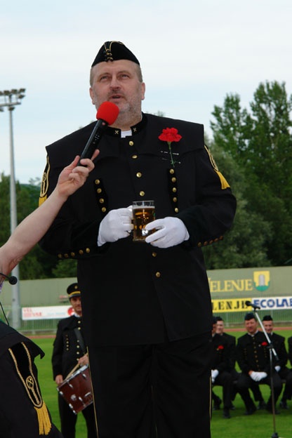 Častni skakalec Milan Medved govori svoje geslo: »15-krat sem kot komandant parade pred vami stal, več kot 1.000 novincev sem v rudarski stan poslal. Ko pa danes na tem sodu stojim, le eno si želim: 'Naj živi nam večno, naš rudarski srečno!'