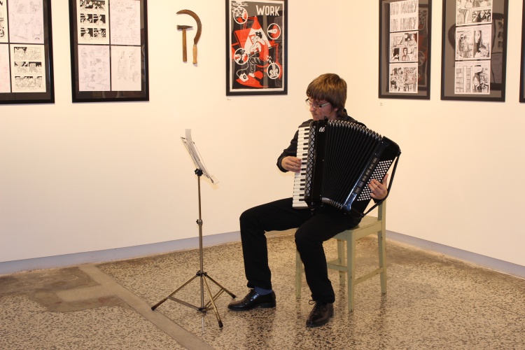 Odprtje razstave sta z glasbenim nastopom popestrila učenca Glasbene šole Frana Koruna Koželjskega Velenje.