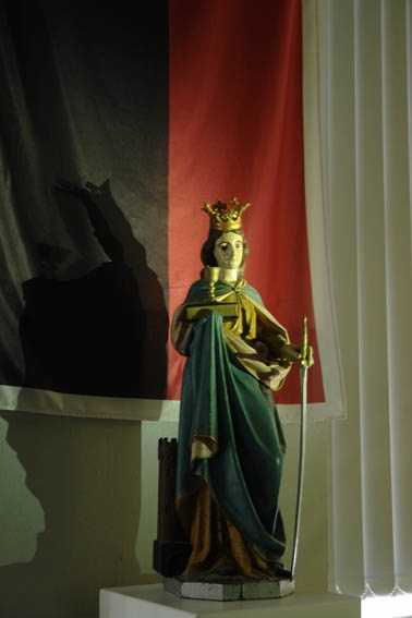 Stolp, s katerim upodabljajo svetnico, je simbol jetništva; kelih, ki je prav tako eden izmed simbolov sv. Barbare, pa pomeni okrepčilo in vir moči, ki ji jo je dajala njena trdna vera.