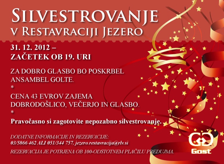 Podjetje Gost vabi 31. 12. 2012 ob 19. uri na silvestrovanje v Restavracijo Jezero v Velenju. Za dobro glasbo bo poskrbel Ansambel Golte.