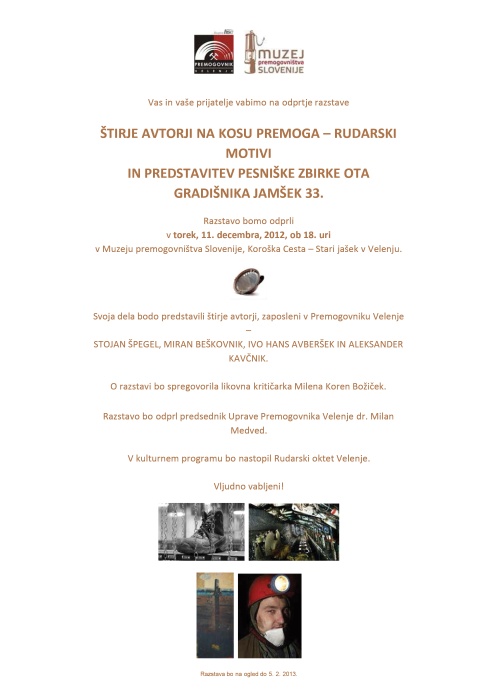 Muzej premogovništva Slovenije vabi na odprtje razstave ŠTIRJE AVTORJI NA KOSU PREMOGA – RUDARSKI MOTIVI IN PREDSTAVITEV PESNIŠKE ZBIRKE OTA GRADIŠNIKA JAMŠEK 33. Razstavo bodo odprli v torek, 11. decembra, 2012, ob 18. uri. Svoja dela bodo predstavili štirje avtorji, zaposleni v Premogovniku Velenje – STOJAN ŠPEGEL, MIRAN BEŠKOVNIK, IVO HANS AVBERŠEK IN ALEKSANDER KAVČNIK.