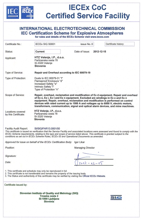 HTZ Velenje, kot največja delavnica za servis in popravilo Ex-opreme v Sloveniji, že ima pridobljen evropski certifikat za servis in popravilo takšne opreme. Temu je zdaj dodal še certifikat z zahtevami mednarodne zakonodaje po shemi IECEx. Pridobljeni certifikat je zagotovilo, da HTZ izvaja servis in popravila opreme za obratovanje v eksplozijsko ogroženih prostorih po strogih kriterijih te sheme. S tem je podjetju omogočeno še večje zaupanje poslovnih partnerjev v kakovost njegovih storitev tako na slovenskem kot tudi na mednarodnih trgih.