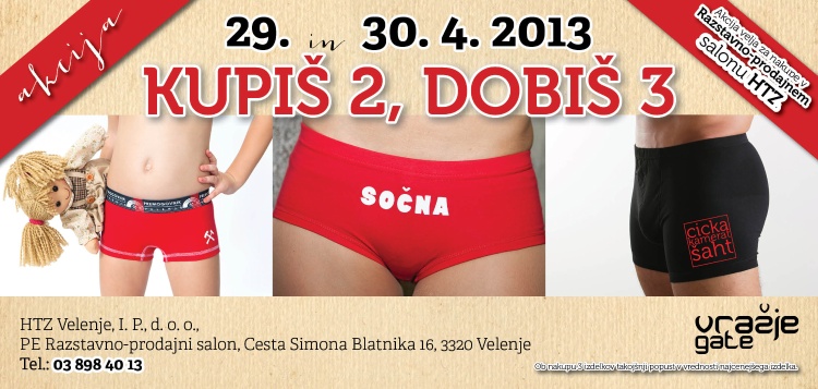 HTZ Velenje vabi k nakupu vražjih spodnjic. Pri nakupu v ponedeljek, 29. aprila, in v torek, 30. aprila, boste kupili dvojne spodnjice, prejeli pa tri. Akcija velja samo za nakupe v Razstavno-prodajnem salonu HTZ na Cesti Simona Blatnika 16 v Velenju. Informacije na 03 898 40 13.