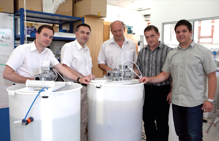 Na fotografiji: Sodelavci projekta Membranski bioreaktor za čiščenje podtalnice: dr. Gasan Osojnik, prof. dr. Albin Pintar (oba Kemijski inštitut Ljubljana), Bojan Voh, Matej Vošnjak (HTZ Velenje) in Matjaž Ravnjak (RCE).