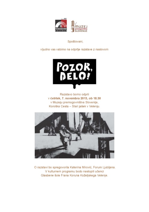 V četrtek, 7. novembra 2013, ob 18.30 vas vljudno vabimo v Muzej premogovništva Slovenije na odprtje razstave z naslovom Pozor, delo! O razstavi bo spregovorila Katerina Mirović, Forum Ljubljana. V kulturnem programu bodo nastopili učenci Glasbene šole Frana Koruna Koželjskega Velenje.