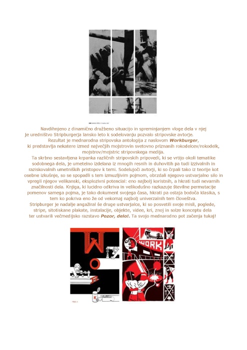 Navdihnjeno z dinamično družbeno situacijo in spreminjanjem vloge dela v njej je uredništvo Stripburgerja lansko leto k sodelovanju pozvalo stripovske avtorje.