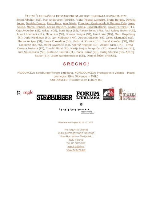 Bojan Albahari (SI), Max Andersson (SE/DE), Arara (Miguel Carneiro, Bruno Borges, Dayana Lucas, Daniela Duarte, Pedro Nora, Ana Tórrie, Francisco Queimadela & Mariana Caló, Nuno Sousa, Marco Mendes, Carlos Pinheiro, André Lemos, Ruca/Dr.Urânio, David Ferreira) (PL), Kaja Avberšek (SI), Arkadi (DE), Boris Beja (SI), Pakito Bolino (FR), Paul Ashley Brown (UK), Anna Ehrlemark (SE), Mina Fina (SI), Domen Finžgar (SI), Lars Fiske (NO), Matti Hagelberg (FI), Jyrki Heikkinen (FI), Igor Hofbauer (HR), Jeroen Janssen (BE), Jakob Klemenčič (SI), Marko Kociper (SI), Tanja Komadina (SI), Marko A. Kovačič (SI), David Krančan (SI), Olaf Ladousse (BE/ES), Matej Lavrenčič (SI), Andraž Magajna (SI), Akinori Oishi (JA), Teresa Camara Pestana (PT), Tomáš Přidal (SI), Marija Mojca Pungerčar (SI), Marcel Ruijters (NL), Lars Sjunnesson (SE), Mateusz Skutnik (PL), Boris Stanič (RS), Matej Stupica (SI), Andrej Štular (SI),Lasse Wandschneider (DE), Danijel Žeželj (HR/US).