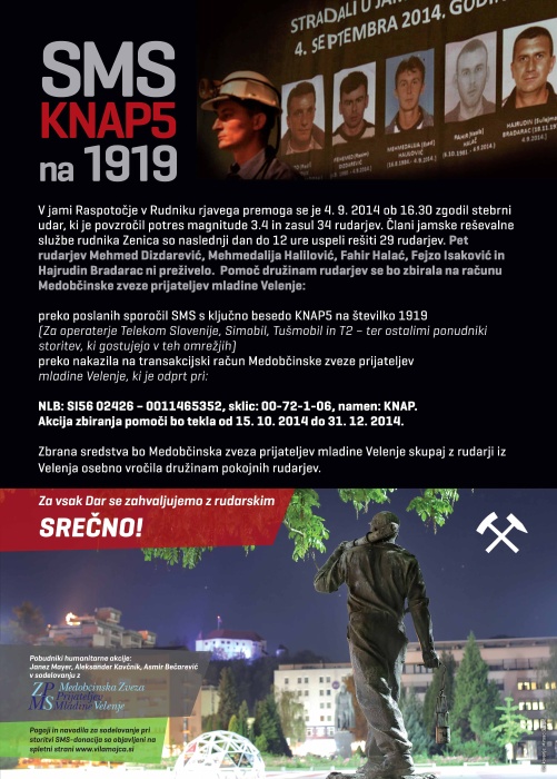 - preko nakazila na tekoči račun Medobčinske zveze prijateljev mladine Velenje, ki je odprt pri NLB: 02426 – 0011465352, sklic: 00-72-1-06, namen: za rudarje.