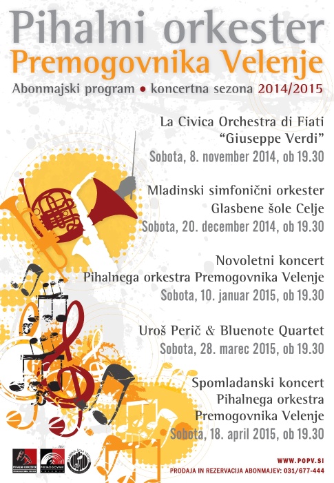 Že prvi abonmajski večer bo namenjen gostujočim glasbenikom. 8. novembra 2014 bodo Veliko dvorano Glasbene šole Frana Koruna Koželjskega Velenje napolnile melodije, ki jih bodo iz svojih instrumentov privabili člani tržaškega mestnega pihalnega orkestra La Civica Orchestra di Fiati Giuseppe Verdi. S široko paleto glasbenega repertoarja za pihalni orkester razveseljujejo poslušalce že več kot devet desetletij.