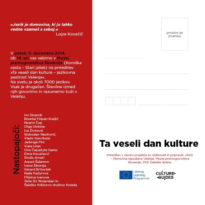Vabimo vas na prireditev »Ta veseli dan kulture – jezikovna pestrost Velenja«, ki bo v petek, 5. decembra 2014, ob 18. uri v Muzeju premogovništva Slovenije v Velenju (Koroška cesta – Stari jašek).