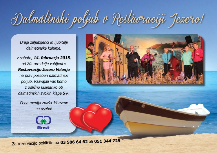 Dragi zaljubljenci in ljubitelji dalmatinske kuhinje v soboto, 14. februarja, vabljeni v Restavracijo Jezero Velenje na prav poseben dalmatinski poljub. Razvajali vas bodo z odlično kulinariko ob dalmatinskih zvokih klape 5+. Cena menija je 14 evrov na osebo.