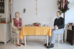 Naslov razstave le delno zajame vse materiale, s katerimi že več kot 50 let ustvarja Viktorija Meh. Tudi blago in les je uporabila, predvsem pa je pri uporabi vseh materialov zelo ustvarjalna in preizkuša nove, izvirne tehnike. Kot vodja keramičarske skupine Gambatte v DŠL je leta 2012 ponudila sodelovanje Zimzelenu z idejo narediti velike forme po motivih iz vsakdanjega življenja in zgodb, ki so vsem blizu. Glineni kipi devetih članov skupine Gambatte zdaj »živijo« v prostorih Zimzelena.