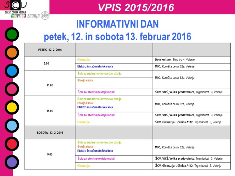 Vse, ki zanimajo tovrstni poklici vabimo na informativne dneve, ki bodo na Šolskem centru Velenje v petek, 12., in v soboto, 13. februarja. Za programe Šole za rudarstvo in varstvo okolja bodo informativni dnevi v Medpodjetniškem izobraževalnem centru na Koroški cesti 62a v Velenju, in sicer v petek ob 11. in 15. uri ter v soboto ob 9. uri.