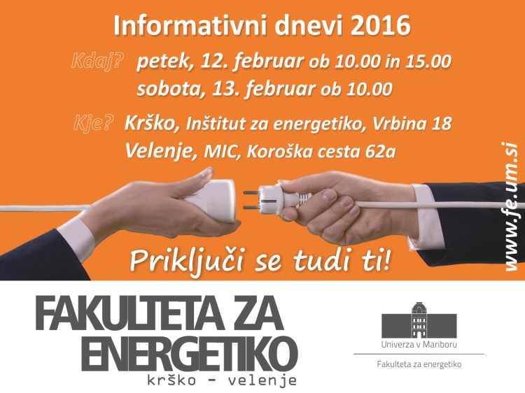 V Krškem bodo informativni dnevi potekali v prostorih Inštituta za energetiko, Vrbina 18, v Velenju pa v prostorih fakultete na Medpodjetniškem izobraževalnem centru Velenje, Koroška cesta 62a.