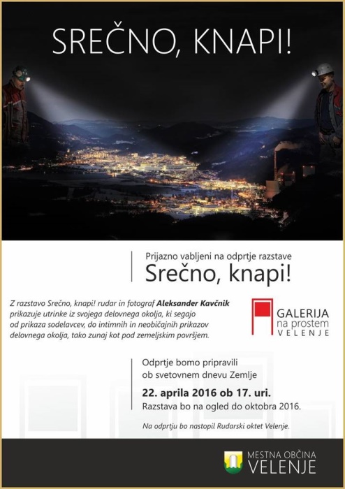 Z razstavo Srečno, knapi! naš sodelavec in fotograf Aleksander Kavčnik prikazuje utrinke iz svojega delovnega okolja, ki segajo od prikaza sodelavcev, do intimnih in neobičajnih prikazov delovnega okolja Premogovnika Velenje, tako zunaj kot pod zemeljskim površjem.