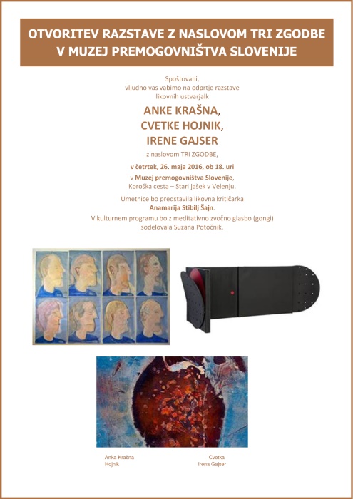 Muzej premogovništva Slovenije vabi na odprtje razstave likovnih ustvarjalk Anke Krašna, Cvetke Hojnik in Irene Gajser (članice Društva likovnih umetnikov Maribor) z naslovom Tri zgodbe v četrtek, 26. maja, ob 18. uri.