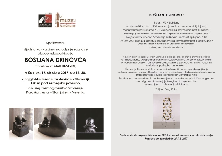 Muzej premogovništva Slovenije vabi na odprtje razstave akademskega kiparja Boštjana Drinovca z naslovom Mali uporniki v četrtek, 19. oktobra 2017, ob 12. 30, v najgloblje ležeče razstavišče v Sloveniji, 160 m pod zemeljsko površino.