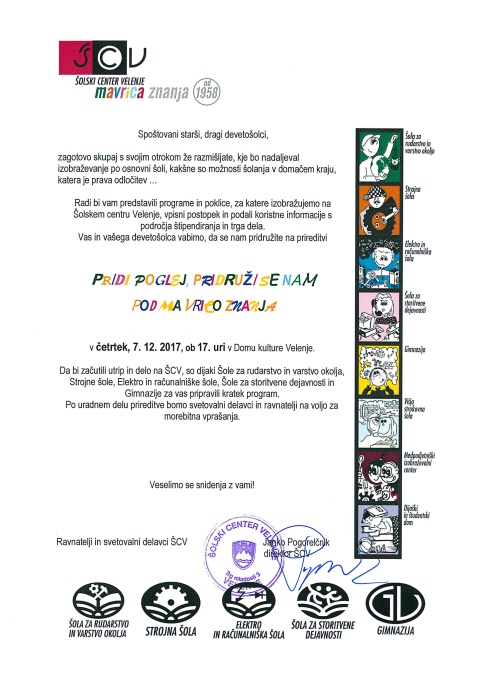 Šolske center Velenje bo v četrtek, 7. decembra 2017, ob 17. uri v Domu kulture Velenje predstavil programe in poklice, za katere izobražujejo na njihovem šolskem centru, vpisni postopek in podali koristne informacije s področja štipendiranja in trga dela.