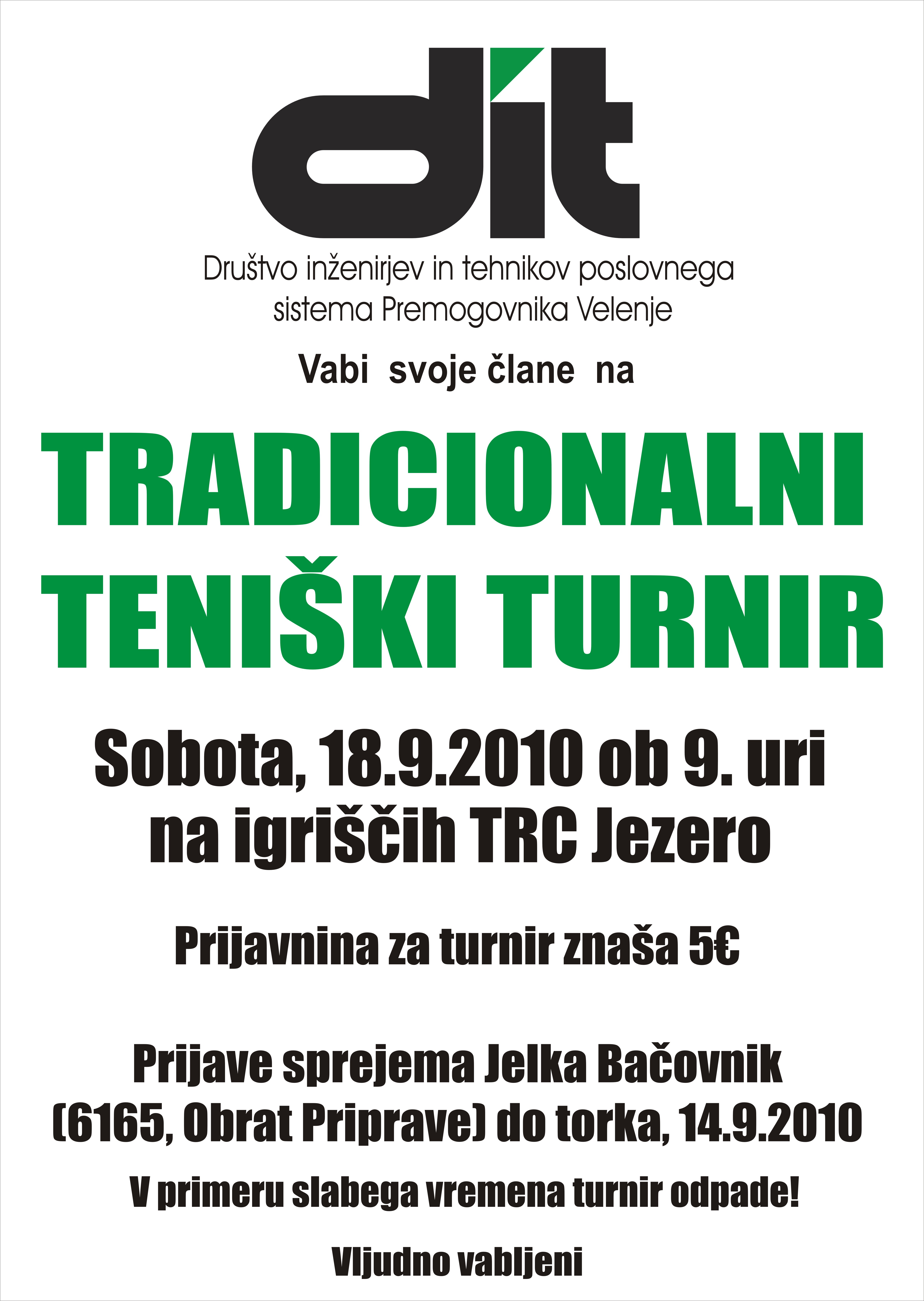 08.09.2010 DIT vabi na tradicionalni teniški turnirDruštvo inženirjev in tehnikov Skupine Premogovnik Velenje vabi svoje člane na tradicionalni teniški turnir, ki bo v soboto, 18. septembra 2010, ob 9. uri, na igriščih Turistično rekreacijskega centra Jezero v Velenju. Prijavnina znaša 5 eur. Prijave sprejema Jelka Bačovnik iz obrata Priprave na interni številki 61 65, in sicer do torka, 14. septembra 2010. Vabljeni!