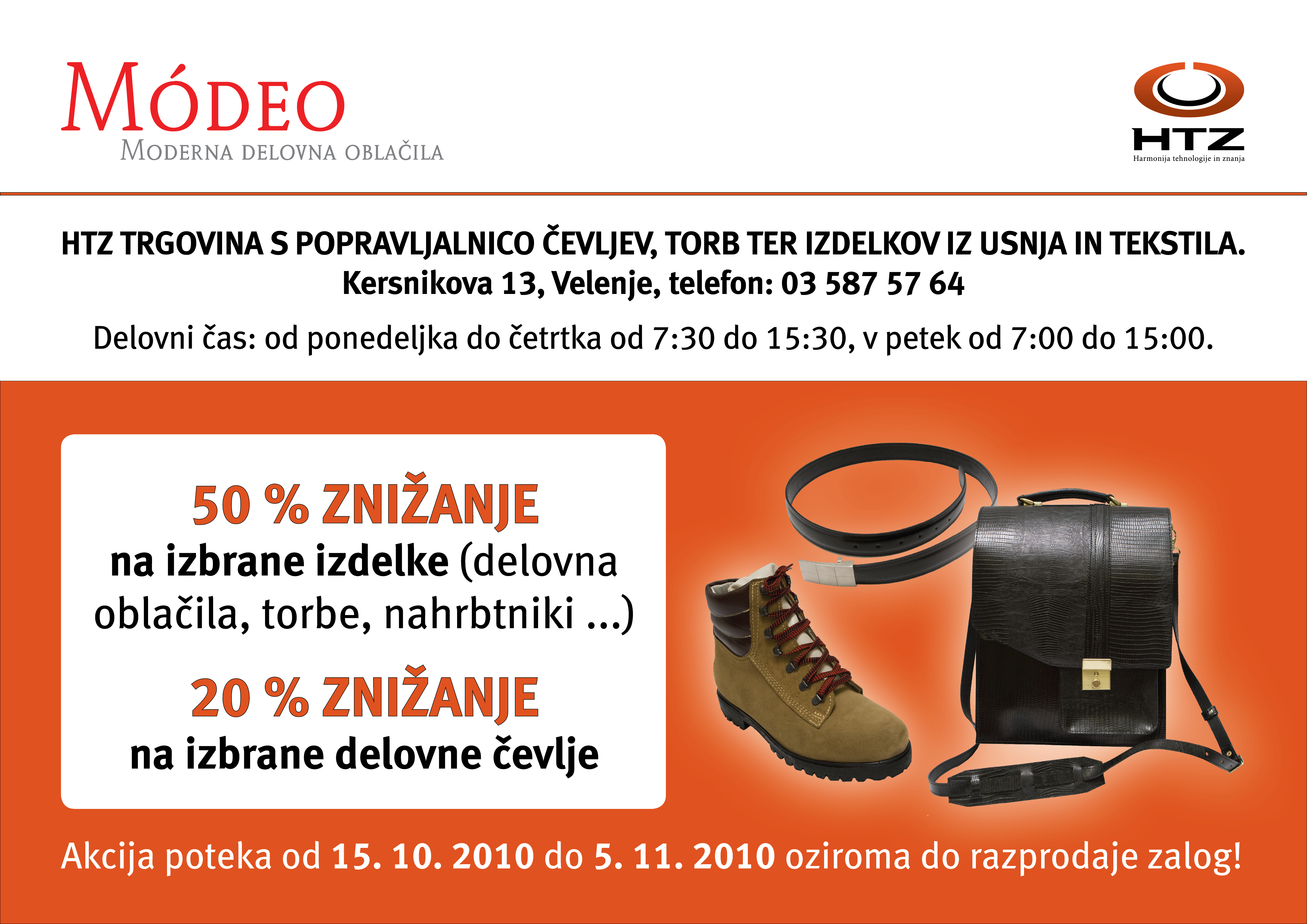 v Trgovini HTZ, na Kersnikovi cesti 13 v Velenju, poteka znižanje cen izbranih artiklov iz zaloge. 50 % znižanje velja na izbrana delovna oblačila, torbe in nahrbtnike ter 20 % znižanje na izbrane delovne čevlje. Akcija traja do 5. novembra 2010 oziroma do razprodaje zalog.
