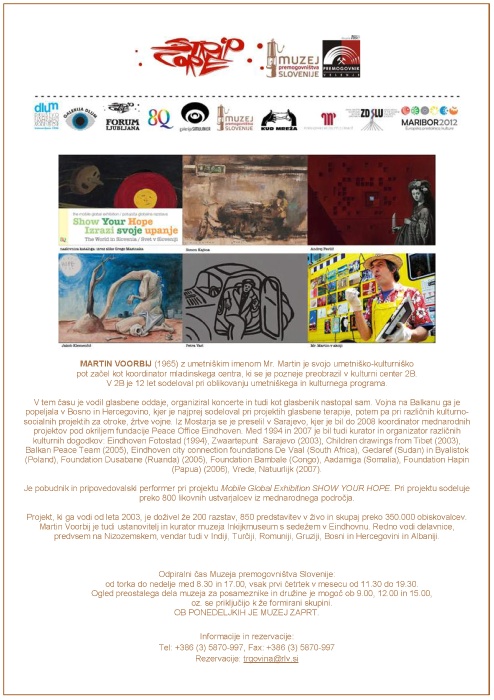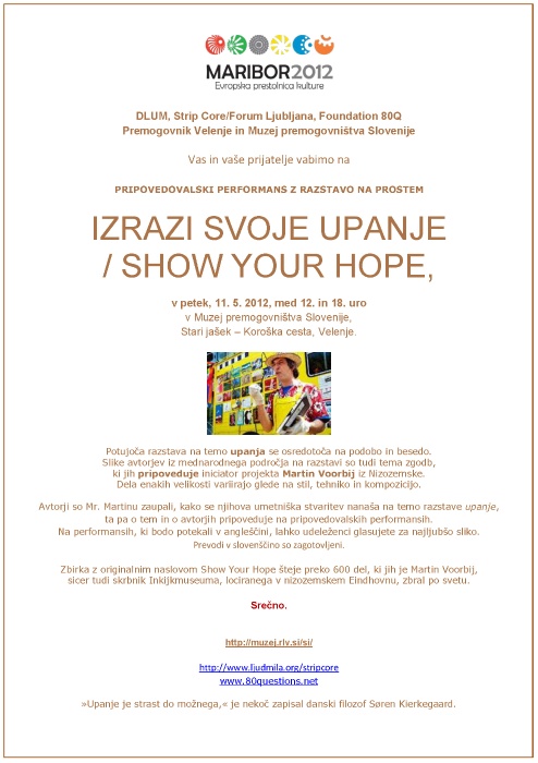 Zbirko slik z naslovom Izrazi svoje upanje (Show your hope) bo nizozemski pobudnik projekta Martin Voorbij predstavil na potujočem kamionu skozi različne zgodbe. Na predstavitvi boste lahko udeleženci glasovali za najljubšo sliko. Zbirka sicer šteje preko 600 del, v galeriji Društva likovnih umetnikov Maribor pa je na ogled preko 100 del različnih avtorjev iz bivše Jugoslavije. Več o samem projektu najdete na spletni povezavi www.80questions.net.