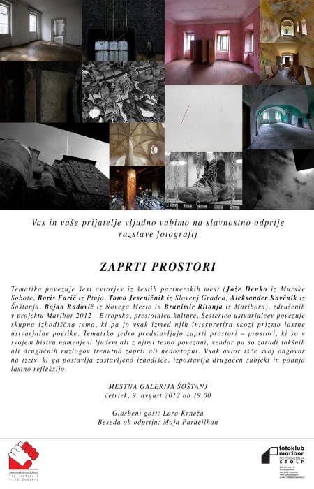 Slavnostno odprtje razstave fotografij z naslovom ZAPRTI PROSTORI bo v četrtek, 9. avgusta 2012, ob 19. uri v Mestni galeriji Šoštanj.