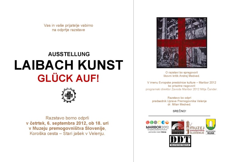 06.09.2012 Na odprtju razstave Laibach Kunst člani Laibacha in njihove največje uspešniceBodite z nami v četrtek, 6. septembra, ob 18. uri v Muzeju premogovništva Slovenije v Velenju na odprtju razstave LAIBACH KUNST – skupaj s člani skupine Laibach in Pihalnim orkestrom Premogovnika Velenje, ki bo na spektakularen način odigral nekaj njihovih največjih uspešnic.